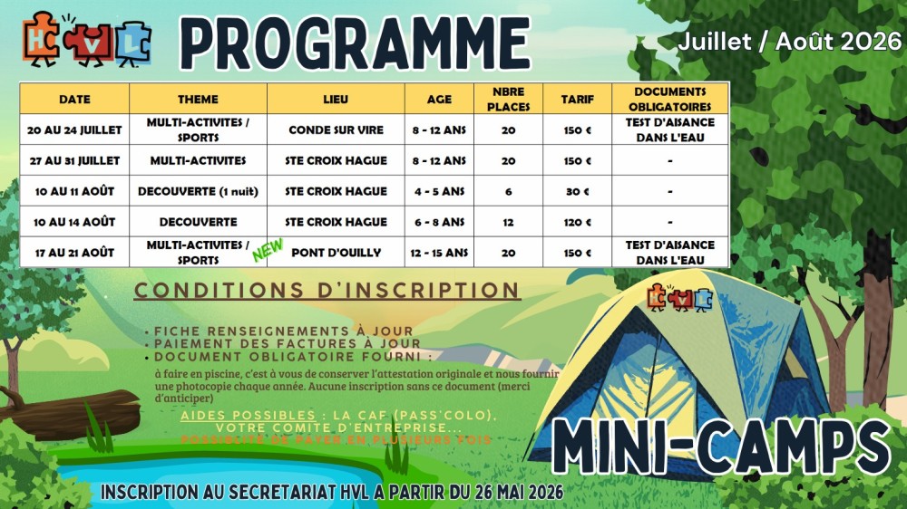 Les inscriptions pour les vacances d'ETE (centre et mini-camps) débuteront le 26/05/2026 ! Retrouvez dès le 19/05 le dossier d'inscription dans l'onglet VACANCES/GRANDES VACANCES.
